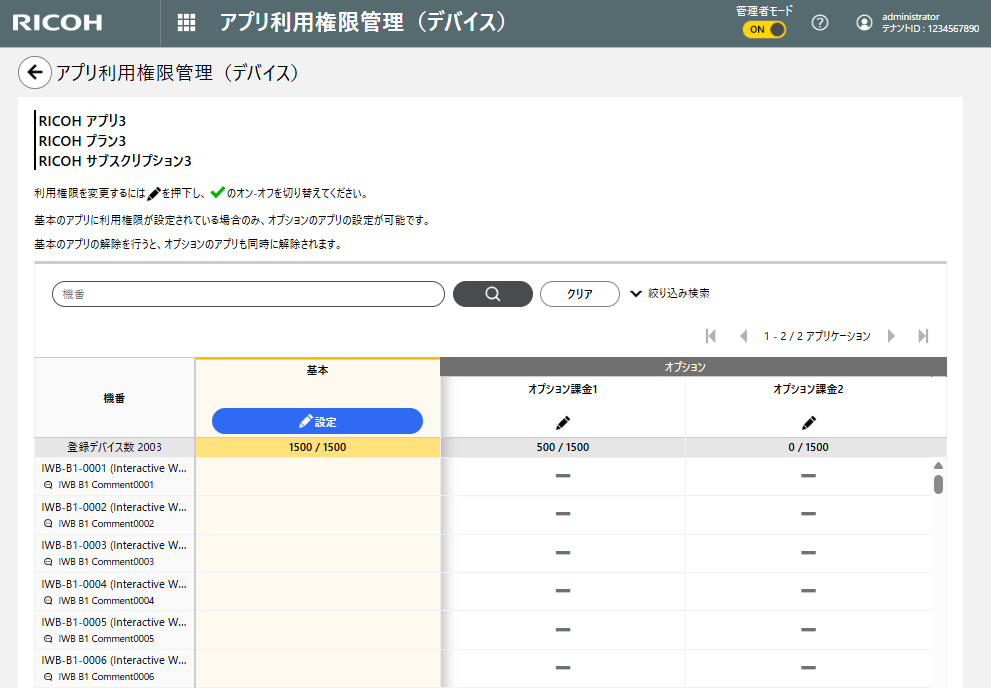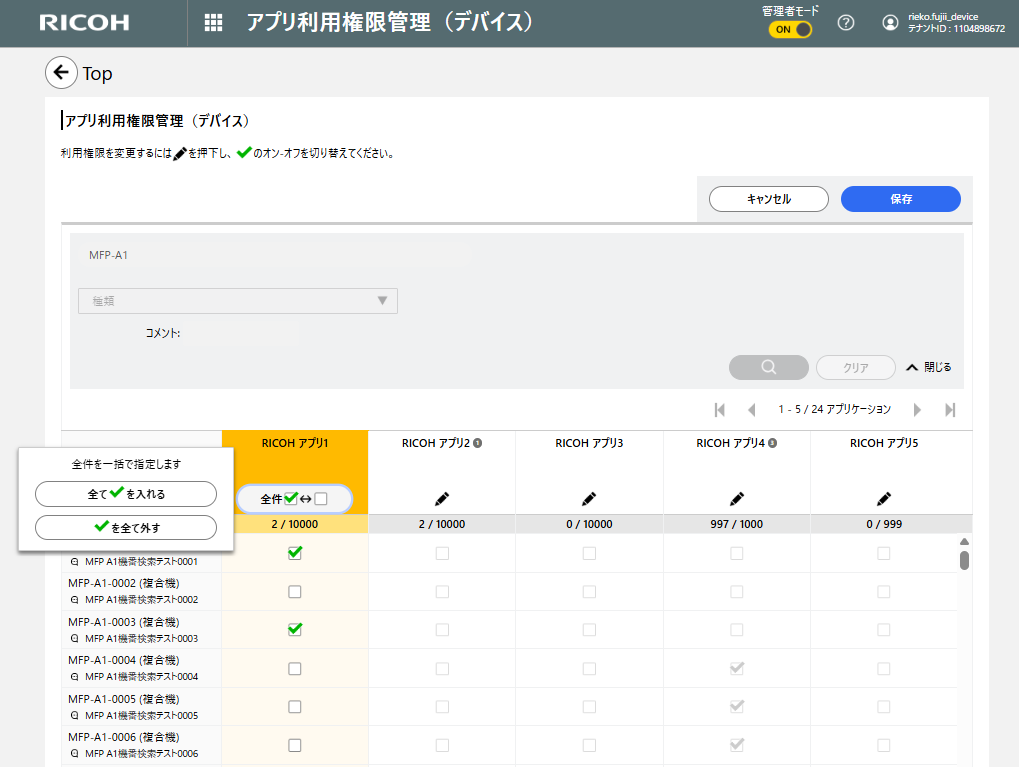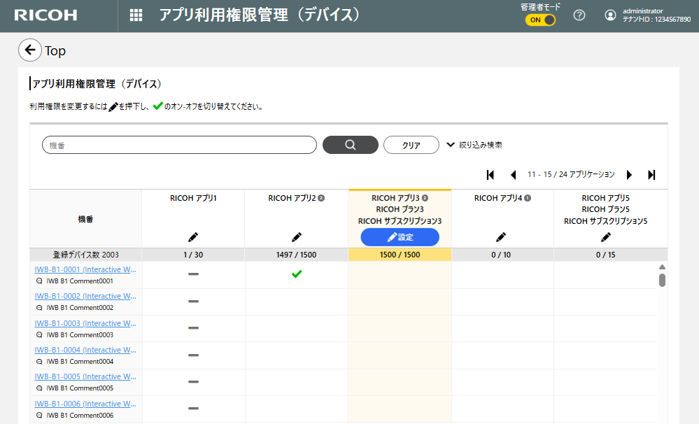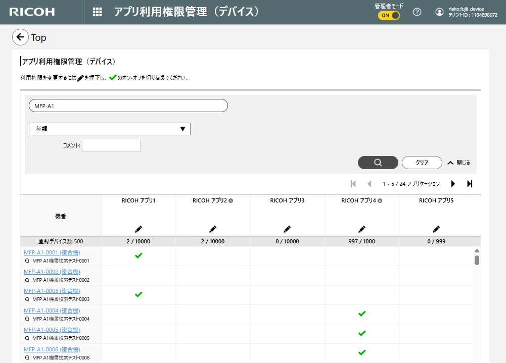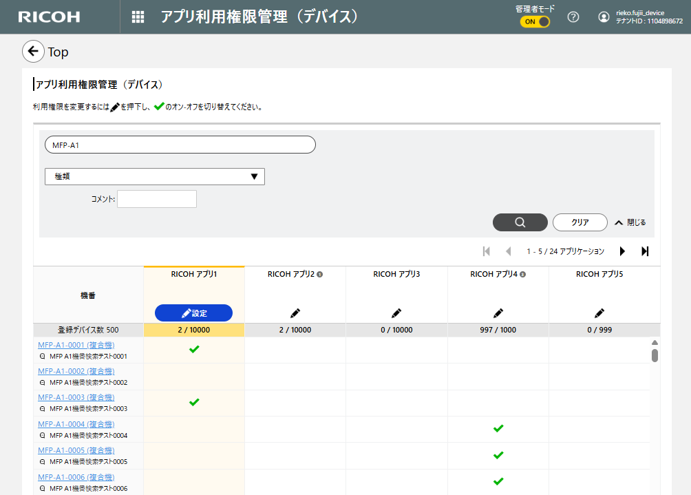 [アプリ利用権限(デバイス)]画面で、アプリ利用権限の設定を変更するデバイスを検索します。