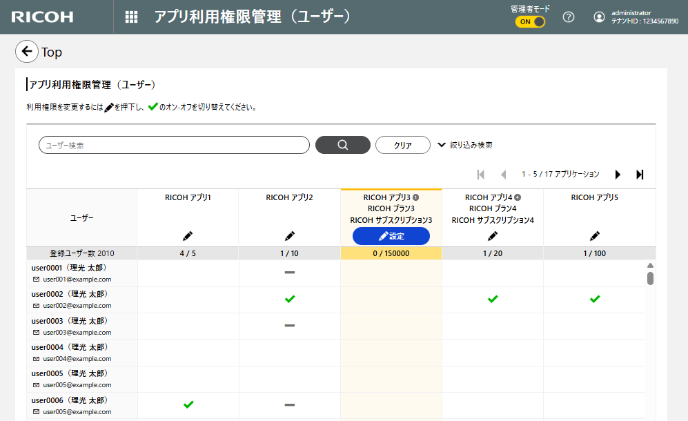 [アプリ利用権限(ユーザー)]画面で、アプリ利用権限の設定を変更するユーザーを検索します。