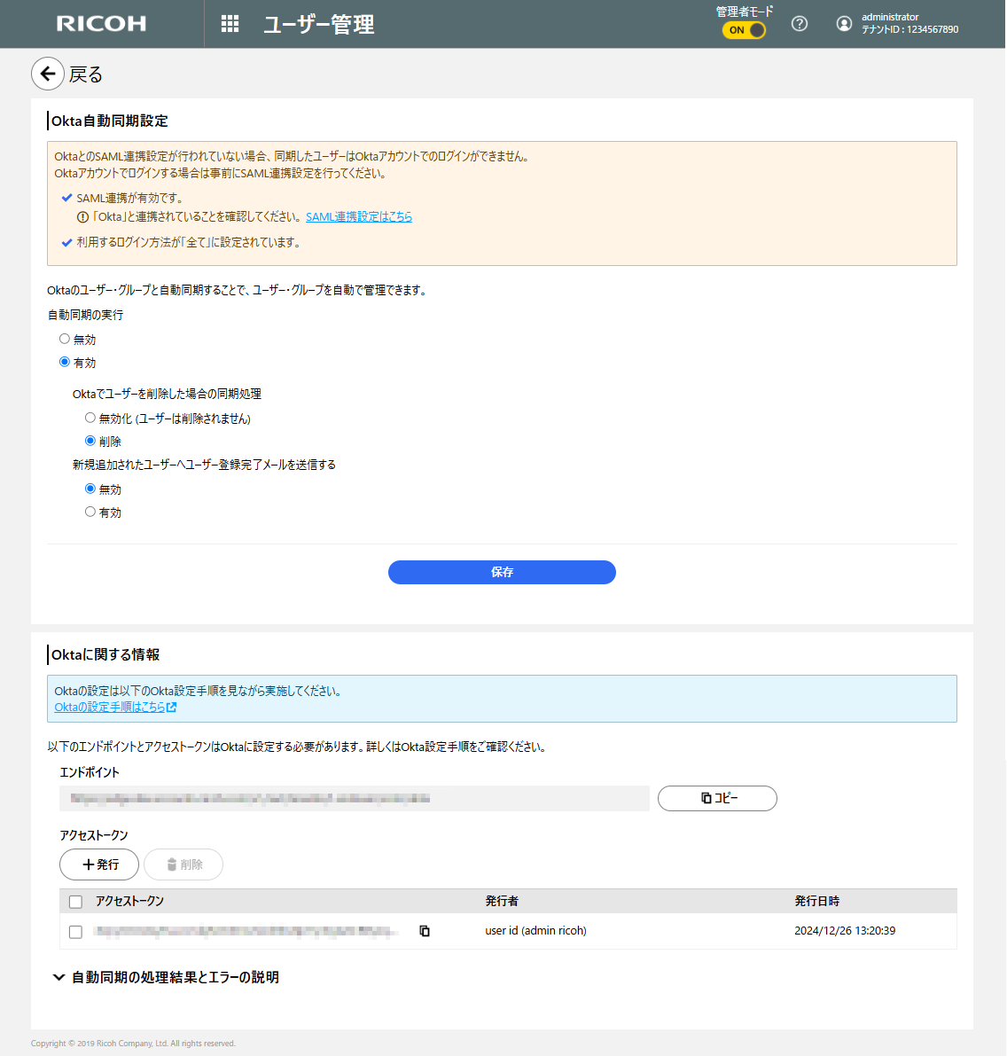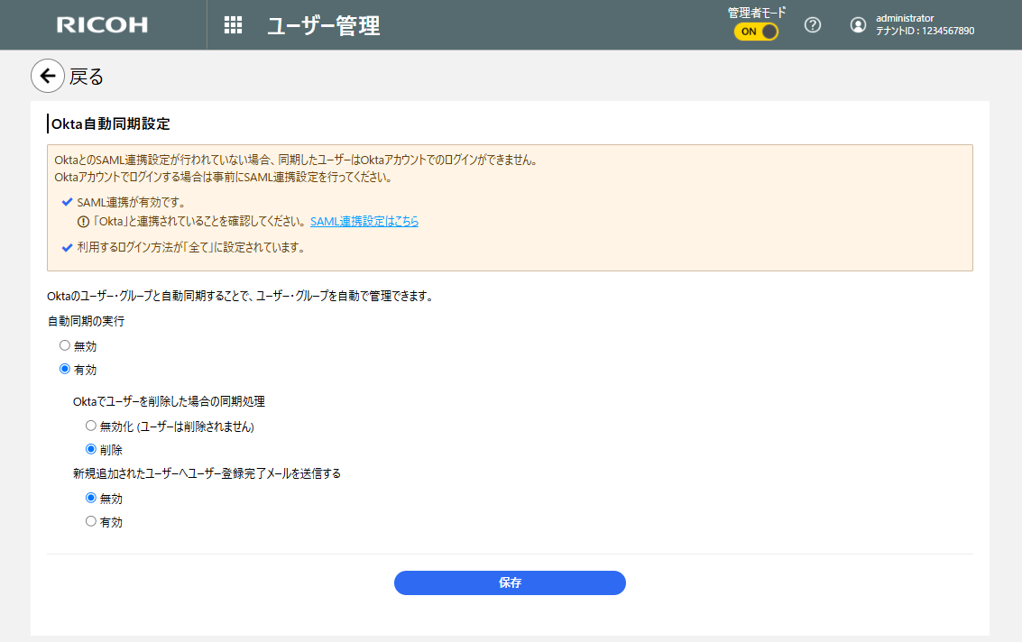- Okta側の設定については、チュートリアル:Oktaのユーザー・グループ情報をリコーのクラウドサービスに自動同期するを参照してください。